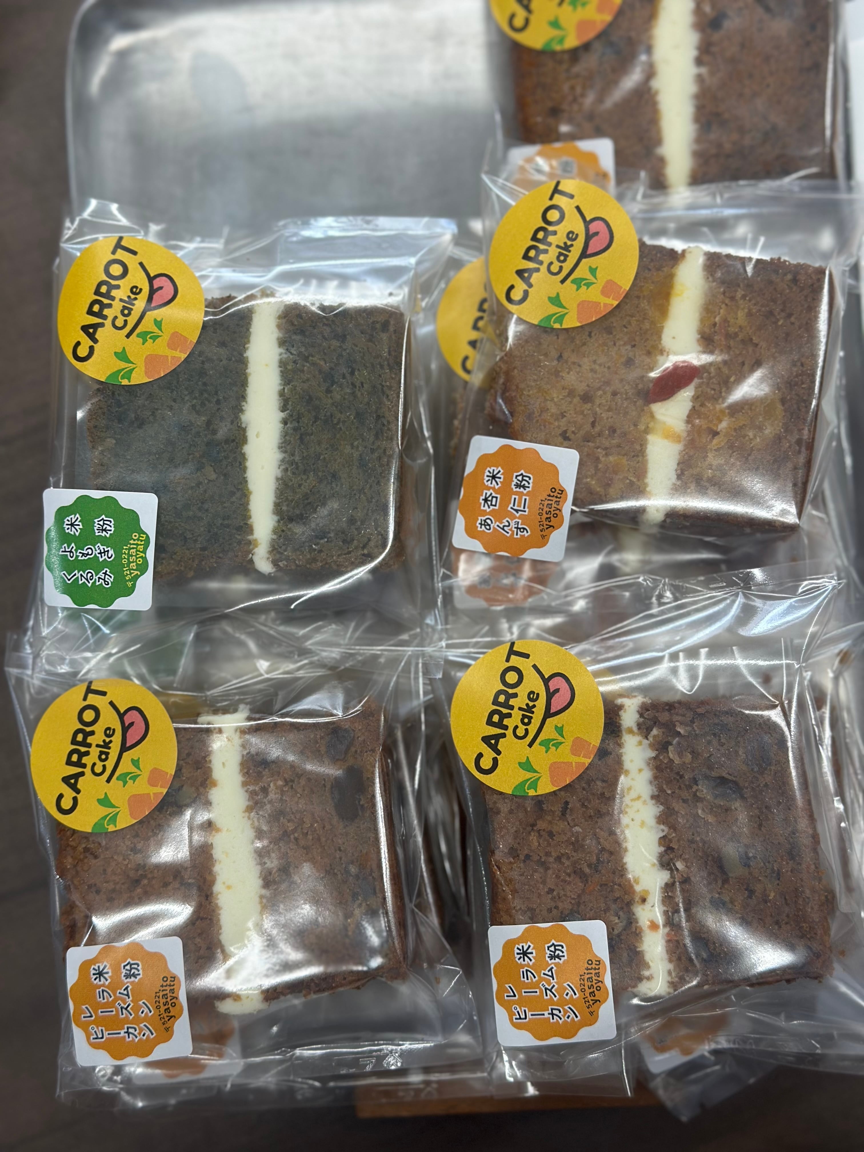 - ベースの原材料:人参(国産)、砂糖、米粉、鶏卵、ナチュラルチーズ、米油、バターミルクパウダー、レモン果汁、塩/香料、膨張剤、重曹
